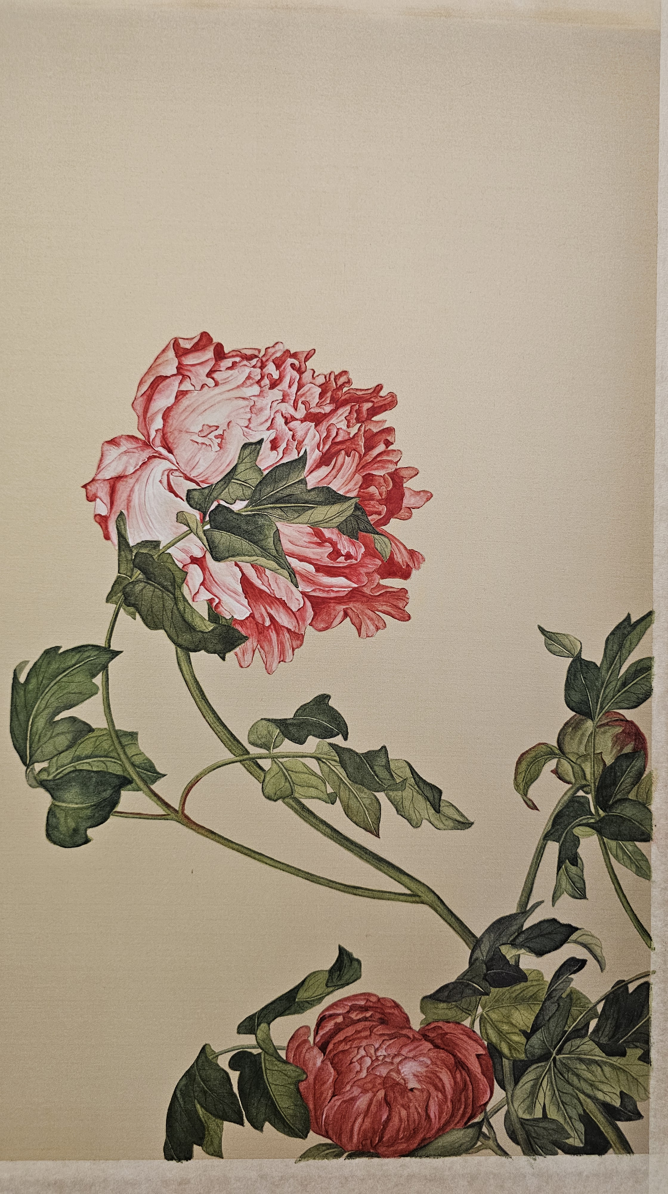 在臨摹這幅牡丹時,我感受到「層層渲染」的挑戰。牡丹的花瓣數量繁複,每片花瓣既要表現細膩的曲線,又要透出光影的立體感。如何將紅色漸層處理得柔和卻不失厚實,是過程中最耗心力的部分。隨著筆觸一點一點堆疊,牡丹逐漸在絹布上盛開,那一刻我深深感受到郎世寧將中西技法結合的魅力。這次的臨摹,對我來說是一次耐心與專注的修行。